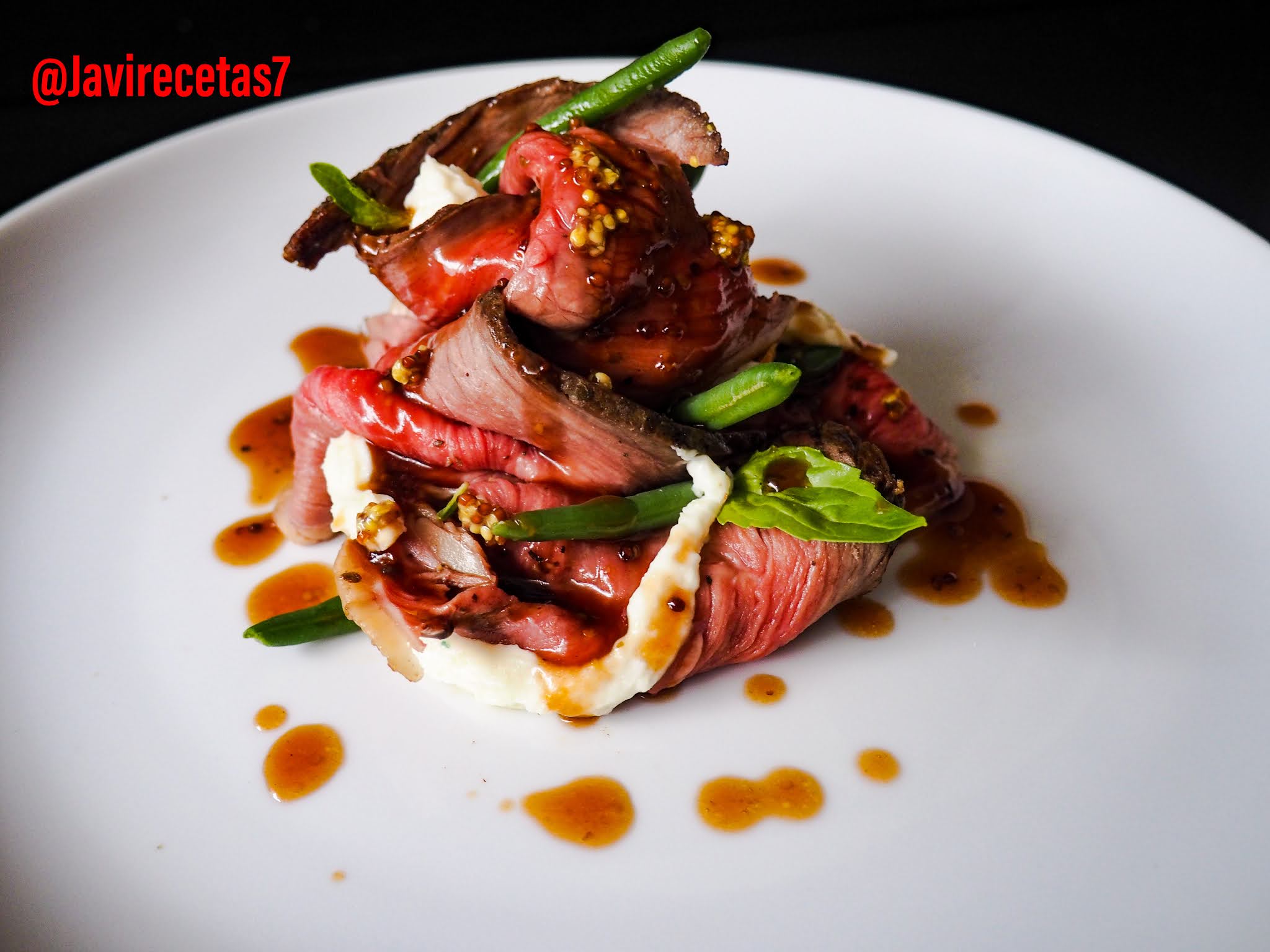 5. Par montar el plato intercalé unas lonchas finas de roast beef con la crema de queso, unas judías al dente, unas hojas de albahaca y por último salseé con la vinagreta de vino.